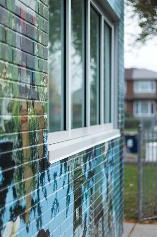 The project was launched with the application of printed murals to the exterior walls of Outlook Manor, a 39-m (128-ft) tall Toronto Community Housing (TCH) apartment building for seniors and single families just south of the intersection of Jane Street and Eglinton Avenue West, and the Fallstaff Community Centre, where free youth programs are offered year-round next to Falstaff Park and near Jane Street and Highway 401.