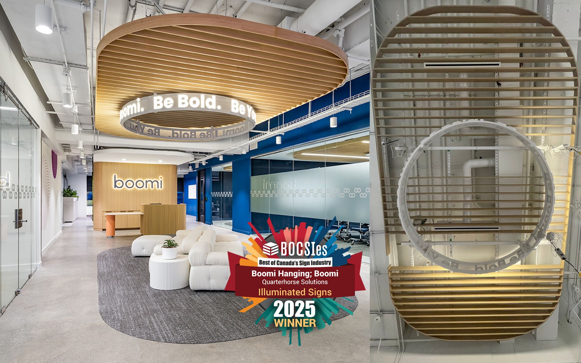 Submitted by Adam Krahn for Boomi in Vancouver, B.C., the project features a large, circular illuminated installation in the company’s reception area, highlighting the tagline “Be Bold. Be You. Be Boomi.” Fabricators constructed the circle using top and bottom hollow rails with a perforated metal screen, while face-lit LED letters were individually mounted and wired through the hollow structure. The installation was engineered in two sections for transport to the 14th floor, then bolted together on site with custom hanging supports. The result is a striking visual focal point that enhances both the office environment and Boomi’s brand presence.