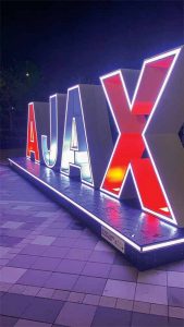 The completed project involved designing, fabricating, and installing the aluminium sign with programmable, colour-changing 3D illuminated letters (spelling AJAX) on an indigo blue platform. Additionally, the Town of Ajax staff received training at Allanson’s facility on how to use and program the LED lighting control system.