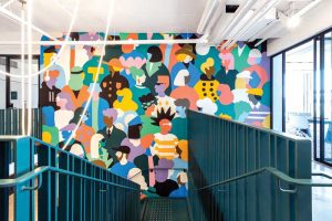 A warm welcome for visitors as they enter the office, the reception area is deemed the heart of the project. The space revolves around a brightly painted, interconnected staircase featuring a custom-designed mural by local artist Rory Doyle. The two-storey vinyl application resembles Trulioo’s most important assets: their people and their diversity.