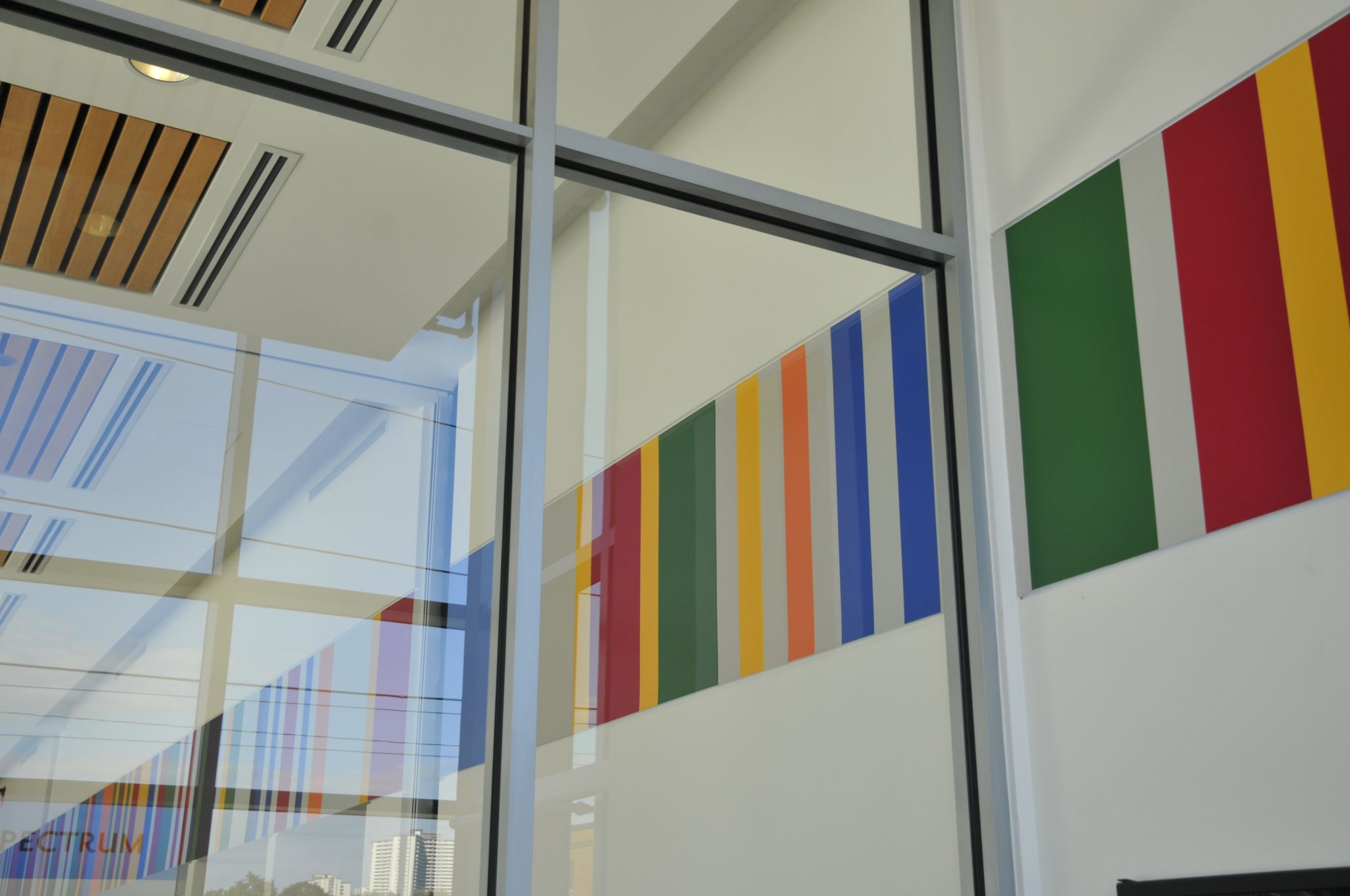 A series of 152 x 800-mm (6 x 31.5-in.) vertical fins, bright yellow on one side and blue on the other, were slotted along the aluminum siding and wrapped around the north and east façades to add to the composition of colours. These fins first become visible when one approaches the building along Dundas Street.
