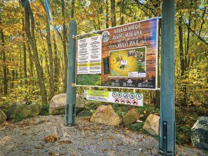 The trailhead signs highlight the path, indicate the location of the trail markers and interpretive signage, and teach users about the culture, flora, and fauna of the area. They praise the natural elements along the trail and encourage users to leave Mother Earth better than they found her. Graphics illustrate the dos and don’ts on the trail, while the Learning Zone provides a list of relevant words to read in English, French, and Anishinaabemowin.