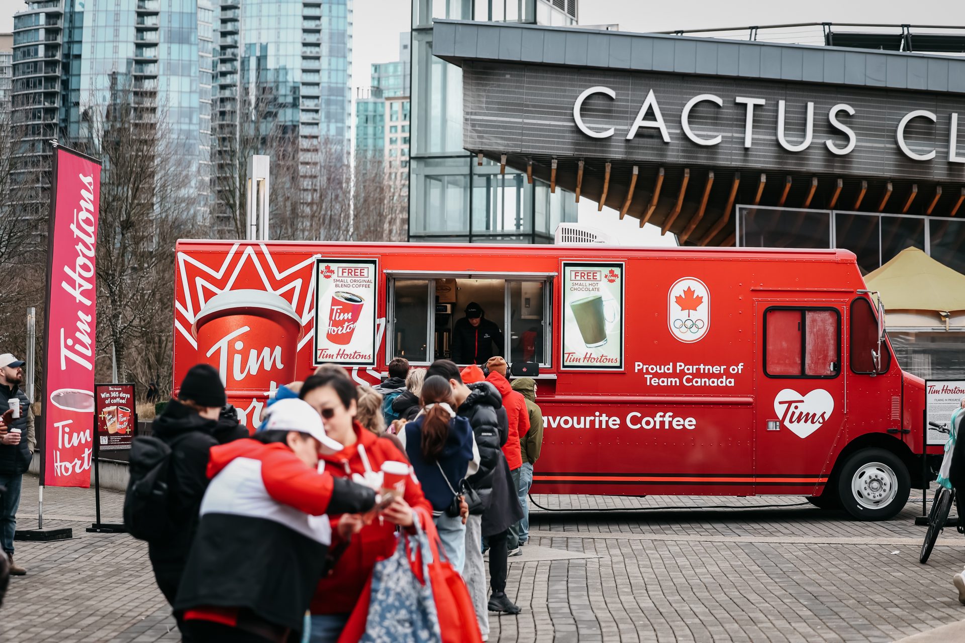 At the FanFest events, a Tim Hortons truck wrapped in Team Canada and Olympic branding became a focal point for fans. Digital screens promoted free small coffees, offering a warm treat while visitors enjoyed live competition viewing.