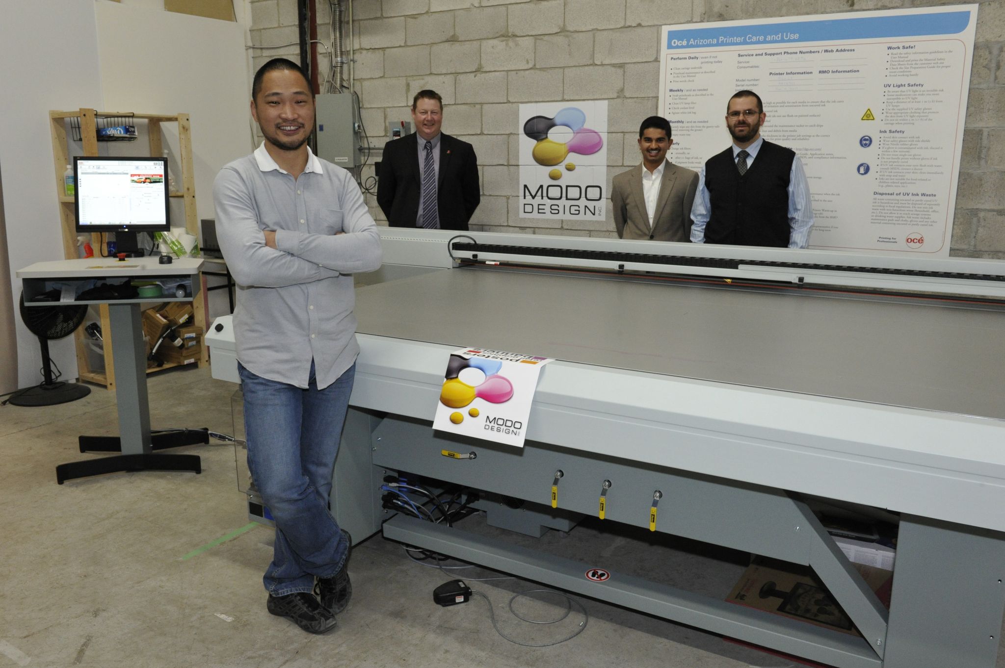 Coast Paper recently installed an Océ Arizona 360GT ultraviolet-curing (UV-curing) flatbed printer for Modo Design in Richmond Hill, Ont. Modo opened in a 92.9-m2 (1,000-sf) facility at the end of 2008. Today, the business operates from a 278.7-m2 (3,000-sf) facility, serving the printing trade through business-to-business (B2B) sales and print brokering of retail signs, retractable banner stands and other graphic applications for advertising. The new printer is expected to help increase production capacity further and shorten turnaround times, with less labour and a reduction of material use, as it can print graphics directly onto substrates. White ink capabilities are also enabling Modo to expand into new markets. “We will open up new possibilities through the continued acquisition of new technologies and the adoption of groundbreaking applications, such as those made possible by the Arizona 360GT,” says Jackie Chan, owner. Another factor in the decision, according to Chan, was expert consultation from Coast Paper. “A strong partnership with your supplier is necessary,” he says.