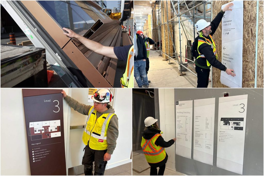 Philcan Group performed the installation on a floor-by-floor basis. Temporary signage was first installed to satisfy temporary occupancy permit requirements, followed by the final signs. Our team regularly reviewed newly completed installations and co-ordinated closely with both construction management and Philcan, ensuring precision in placement, alignment, and consistency throughout the building. Specialized equipment included lifts and scaffolding where required for overhead signage, and precision tools for alignment and leveling of components.