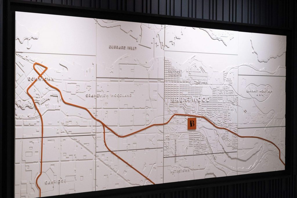 We also created a large 3D map feature where every street and contour was carved into the surface. The tiny road details had to be hand-sanded before painting and installation, which became one of those moments where technology and old-school craftsmanship meet.