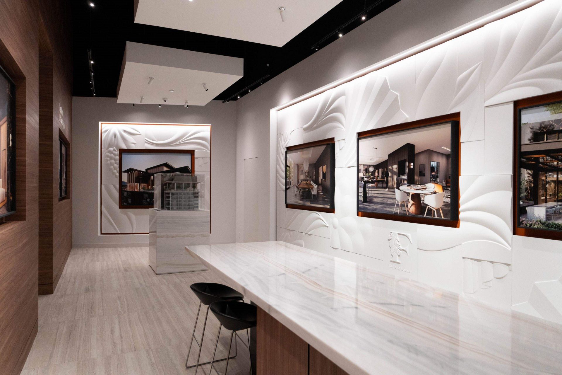 The Bassano presentation centre is one of our favourite projects. It involved a series of complex builds that came together into a beautiful final result. The client wanted a luxurious Italian-inspired feel, so we worked with the design agency to translate their 2D concept into sculpted 3D wall profiles. Our team CNC-cut the panels out of medium-density fibreboard (MDF) and finished them to look like carved marble.